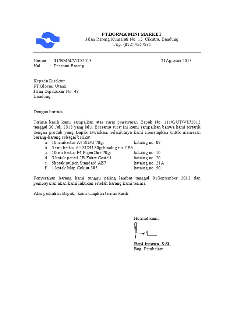 Contoh Surat Pesanan Secara Kredit Yang Memakai Referensi from demo.dokumen.tips Semoga ini bisa menjadi awal kerja sama yang baik dalam kedua belah pihak. Pt selalu jaya jl balen yogyakarta dengan hormat, sehubungan dengan iklan anda pada harian kedaulatan rakyat tanggal 10 april 2011, kami tertarik untuk membeli berbagai jenis peralatan kantor yang anda tawarkan. Dalam surat pesanan tersebut akan tercantum nama nama dan jenis barang yang ingin dibeli, dan juga tata cara pembayaran yang akan dilakukan. Surat pesanan barang diterbitkan oleh calon pembeli dikarenakan ada beberapa kemungkinan, salah satunya adanya penawaran dari pihak penjual. Download contoh surat pesanan barang (balasan penawaran) *password: Surat ini berbentuk dokumen tertulis yang ditujukan kepada pelanggan untuk memberikan informasi tentang produk unggulan yang dimiliki pada sebuah perusahaan, menjalin kerjasama dengan pihak lain, hingga memperluas jaringan bisnis. Adapun pembayaran yang akan kami lakukan dp 30% dan sisanya setelah barang diterima. Adapun surat niaga merupakan salah satu bentuk surat resmi yang penggunaanya tidak bisa ditinggalkan oleh setiap perusahaan.